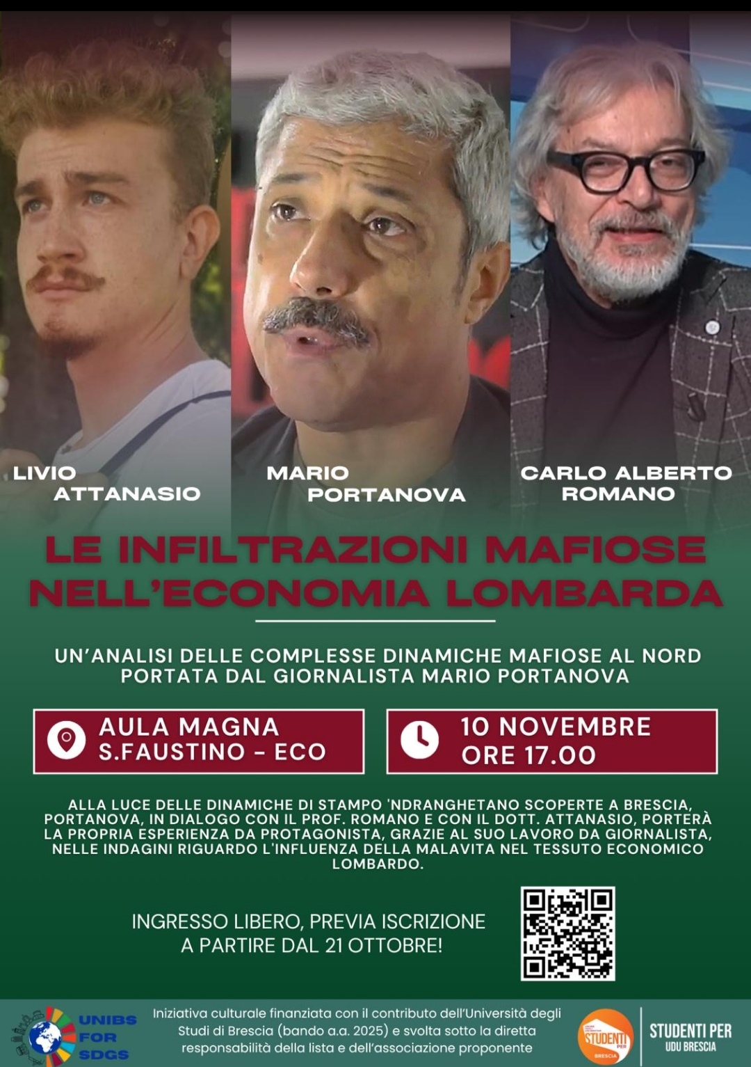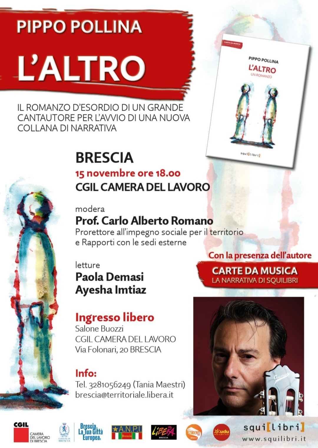 Trasmettiamo le locandine dei seguenti eventi: 10 novembre - "Le infiltrazioni mafiose nell'economia lombarda" Aula Magna Università Studi di Brescia, via San Faustino 74b (GUARDA) e la presentazione del libro di Pippo Pollina dal titolo "L'altro" Camera del Lavoro CGIL - 15 novembre (GUARDA). Agli eventi non sono stati attribuiti crediti formativi.